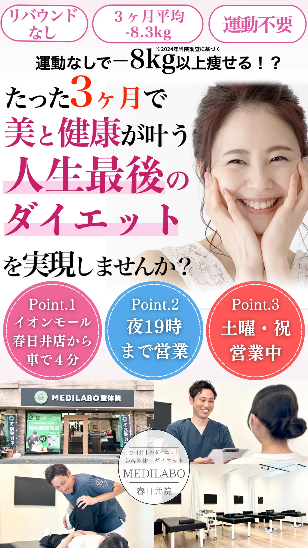 ダイエットのプロとしての証である資格を保有し、数多くのお客様から支持され、あなたの悩みに真正面から向き合う、MEDILABO春日井院に来院し、健康と美容の先にある理想の自分を叶えて心から思いっきり楽しめる人生を手に入れる道。